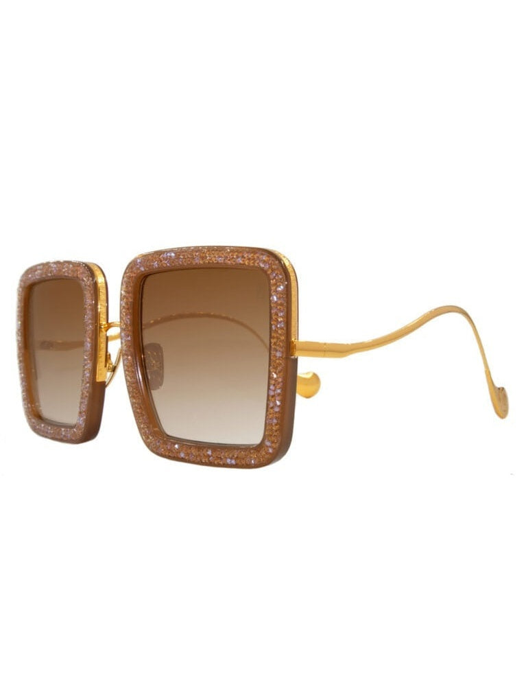 Acetate Rim, Bespoke Swarovski Crystal Sheets, Stainless Steel, Plated in real 24K Gold, ZEISS Lenses engraved with the AKK logo. Model is wearing the color Emerald.