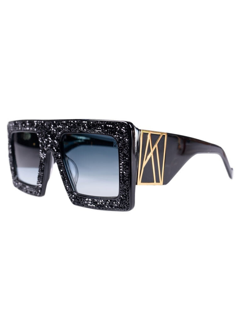 Acetate, Stainless Steel, 24K Gold Plated, Custom made Swarovski Crystals, Carl Zeiss Lenses. Model wearing Mother Beep in Black Black Crystal.