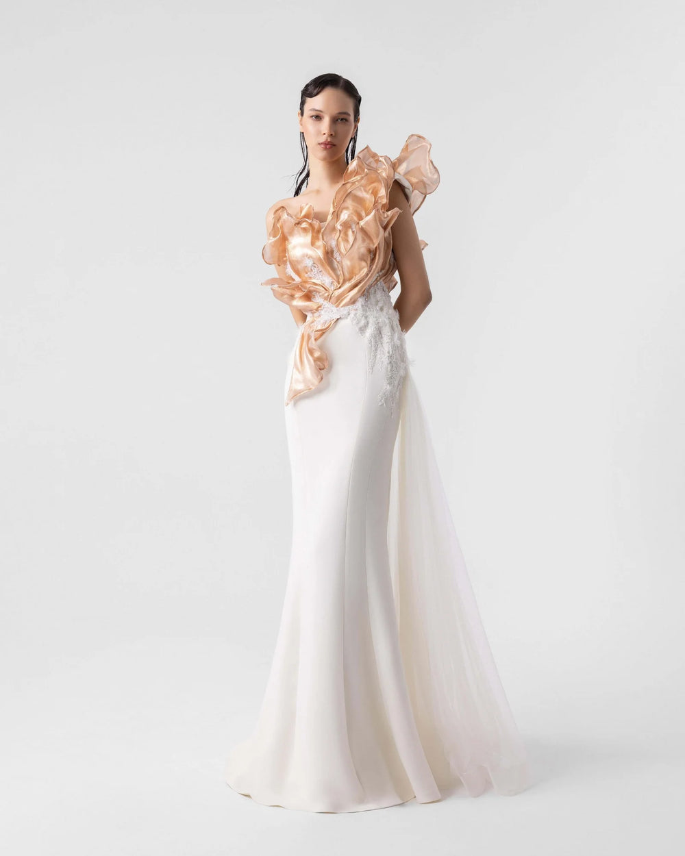 Step into a world of elegance with this exquisite off white mermaid dress featuring sculptural bronze petals that open delicately, curling over the shoulder in a captivating display. The dress combines an unusually shaped lace that splays across an off-white sheer tulle, enhancing the texture and depth of the design. Anchored by a crepe base, the dress merges modern artistry with timeless elegance.