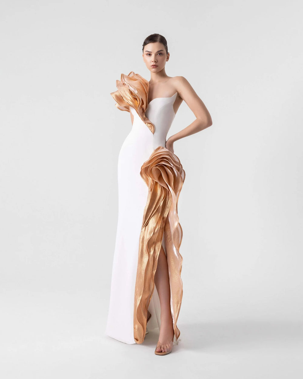 An Exquisite off-white crepe bust gown featuring a one-shoulder ruffled bronze lamé organza design with a cascading high slit, offering an elegant look for any occasion.