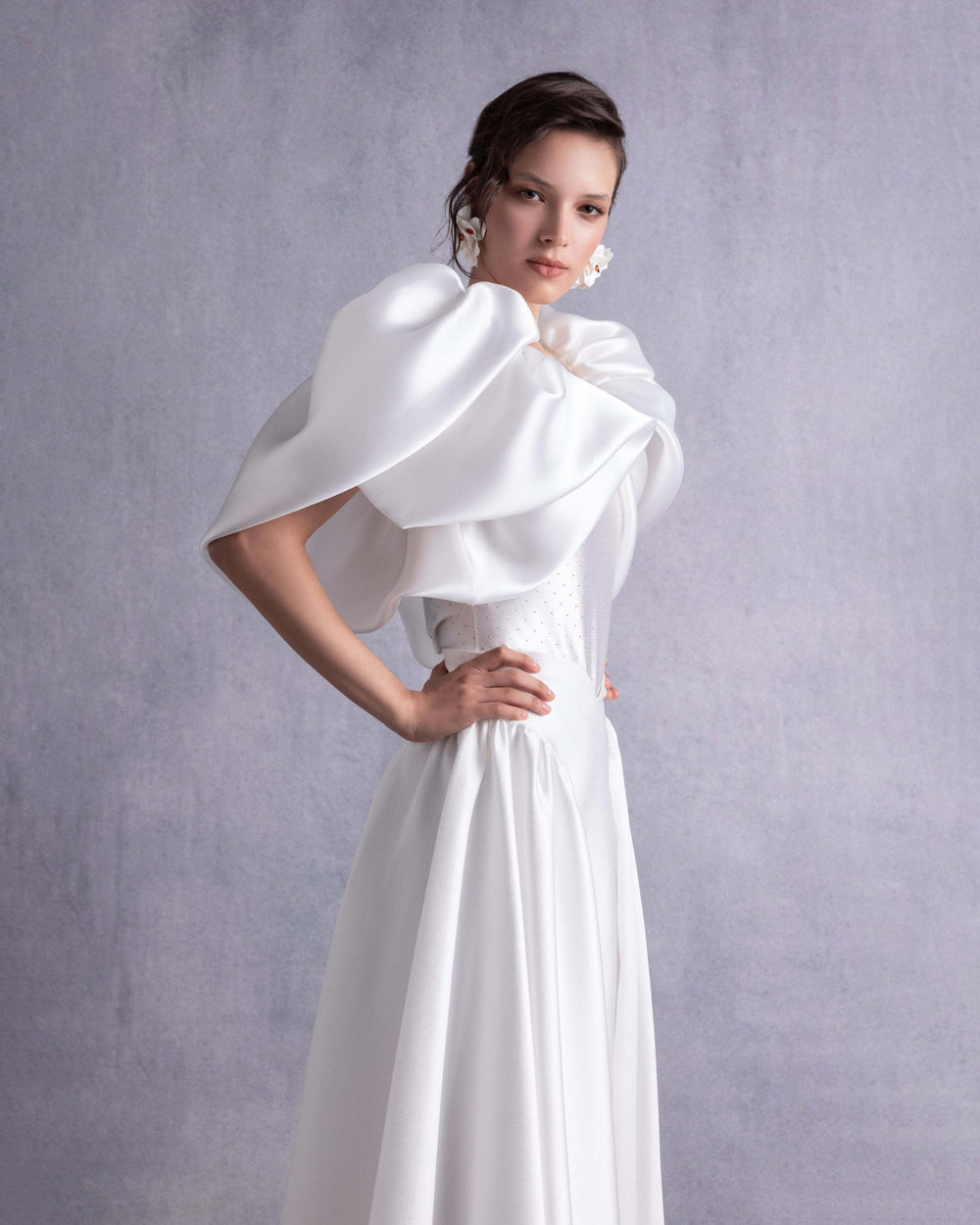 Crystal-Dotted Jersey Body with Petal-like Organza Shoulders (top)