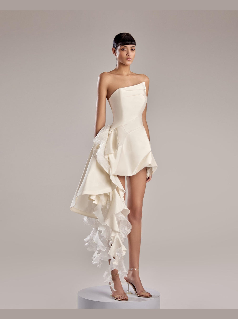 Elegant White Taffeta and Organza Dress with Asymmetrical Hem and Ruffles
