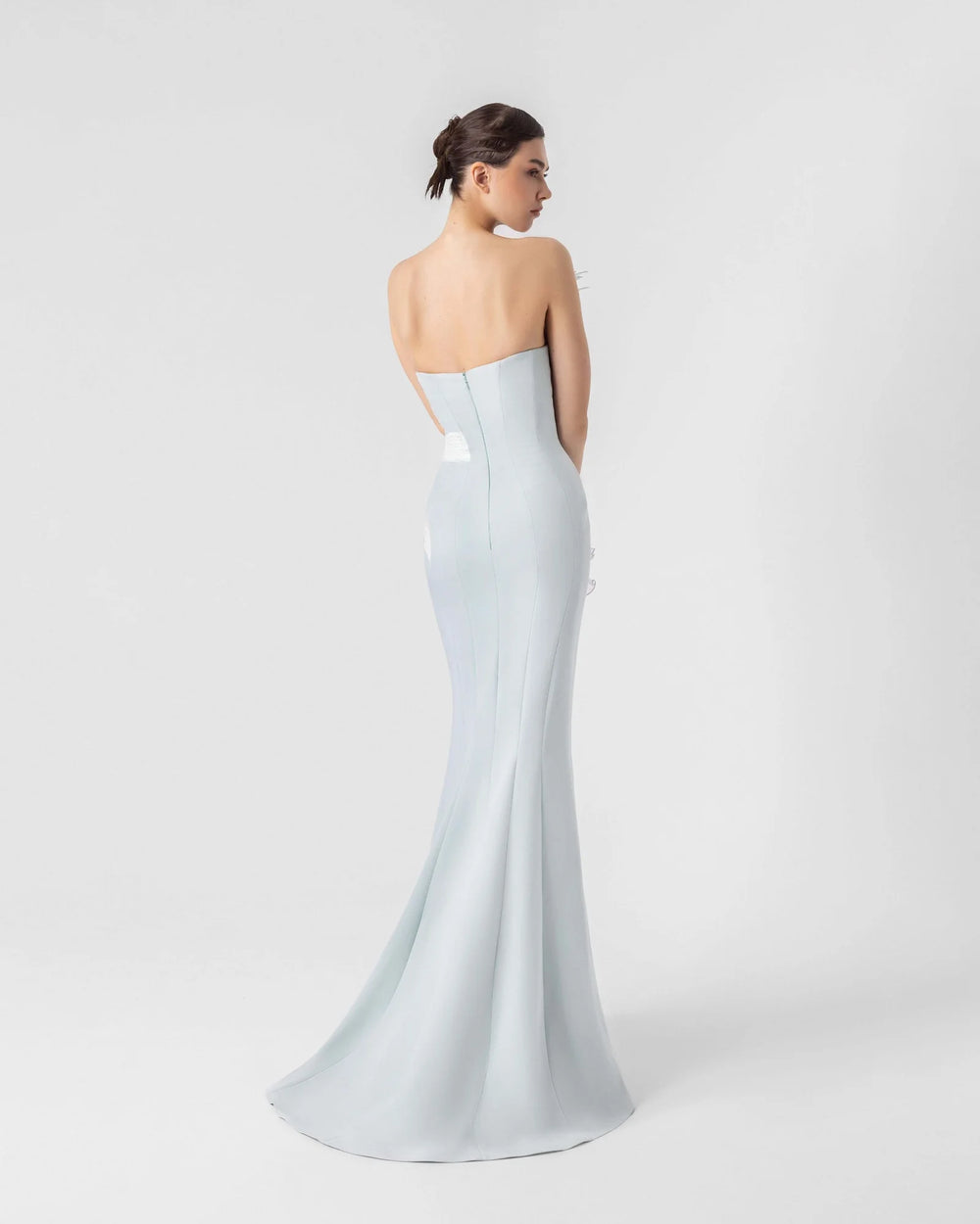 An exquisite mermaid mint blue gown featuring a feathered strapless design with sculptural pleated holographic organza detailing.