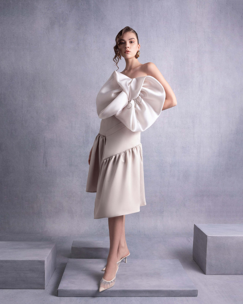 Shine in elegance with this gold champagne cocktail dress. Crafted from luxurious piqué fabric, the dress features a sculptural organza bust manipulation enhanced with dazzling crystal embellishments, creating a stunning focal point. The asymmetrical skirt and tailored strapless bodice ensure a flattering silhouette that combines timeless appeal with contemporary style.