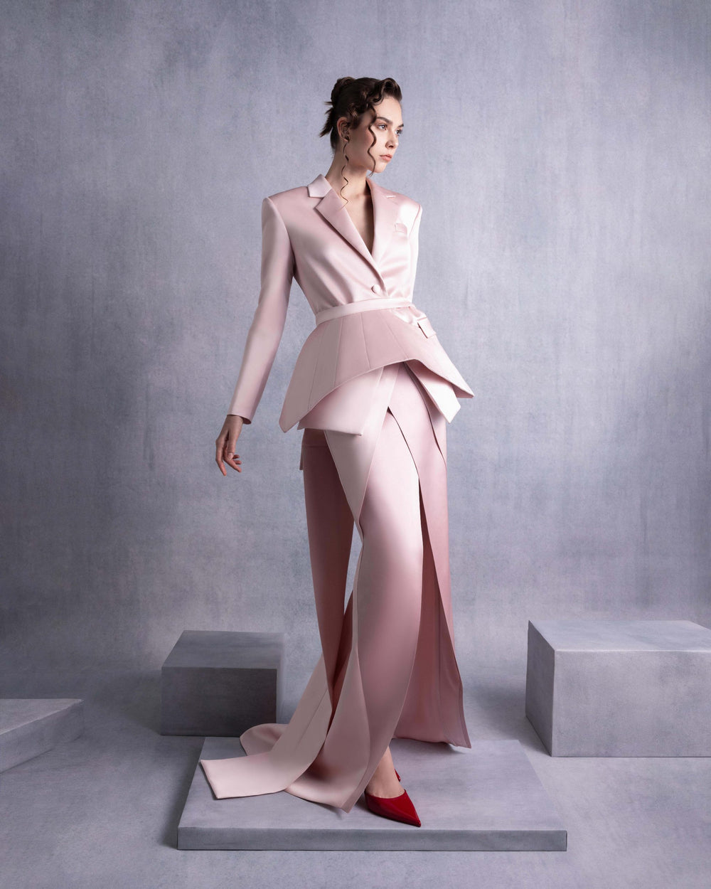 Experience elevated allure with a pink razmir jacket featuring a long, flowing train and a structured peplum effect belt for a modern, elegant silhouette.