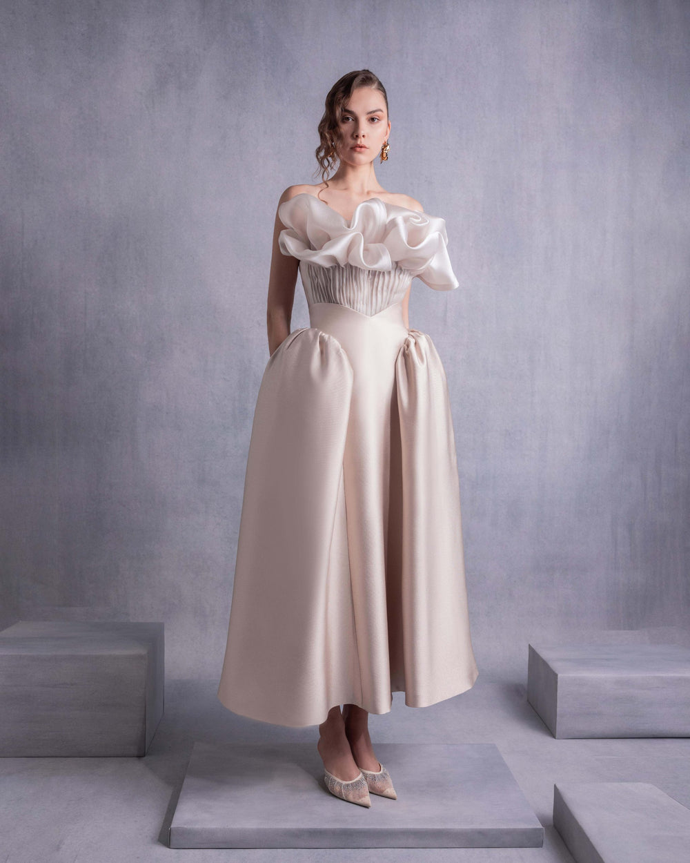 Gold champagne organza corset top with dramatic ruffled neckline and a sculptural silhouette, perfect for formal occasions.
