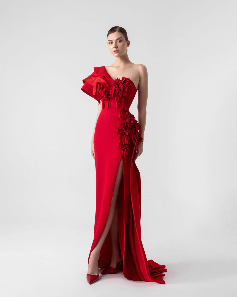 Stun in our crepe red gown featuring a straight-cut silhouette with a high slit, laser-cut 3D appliqué, and a one-shoulder draped design that flows into a side train for an unforgettable look.