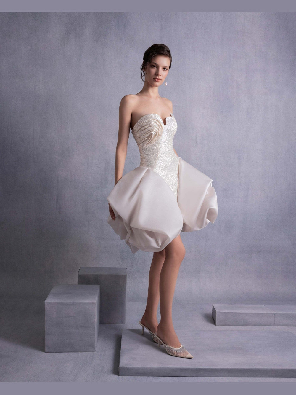 Turn heads with this exquisite champagne sequin mini dress, designed to captivate. The strapless bodice features a carefully crafted angular design, enhanced with intricate 3D manipulation on one side, creating a bold and artistic focal point. The shimmering sequins exude elegance, while the voluminous puffy organza skirt overlay adds drama and sophistication.
