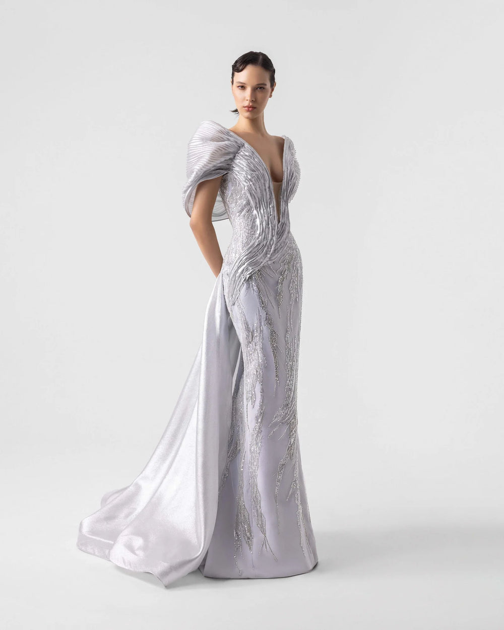 Elegant embellished silver off-shoulder gown, featuring a V-cut bust with off-shoulder accents and shimmering embellished lace. Perfect for evening galas.
