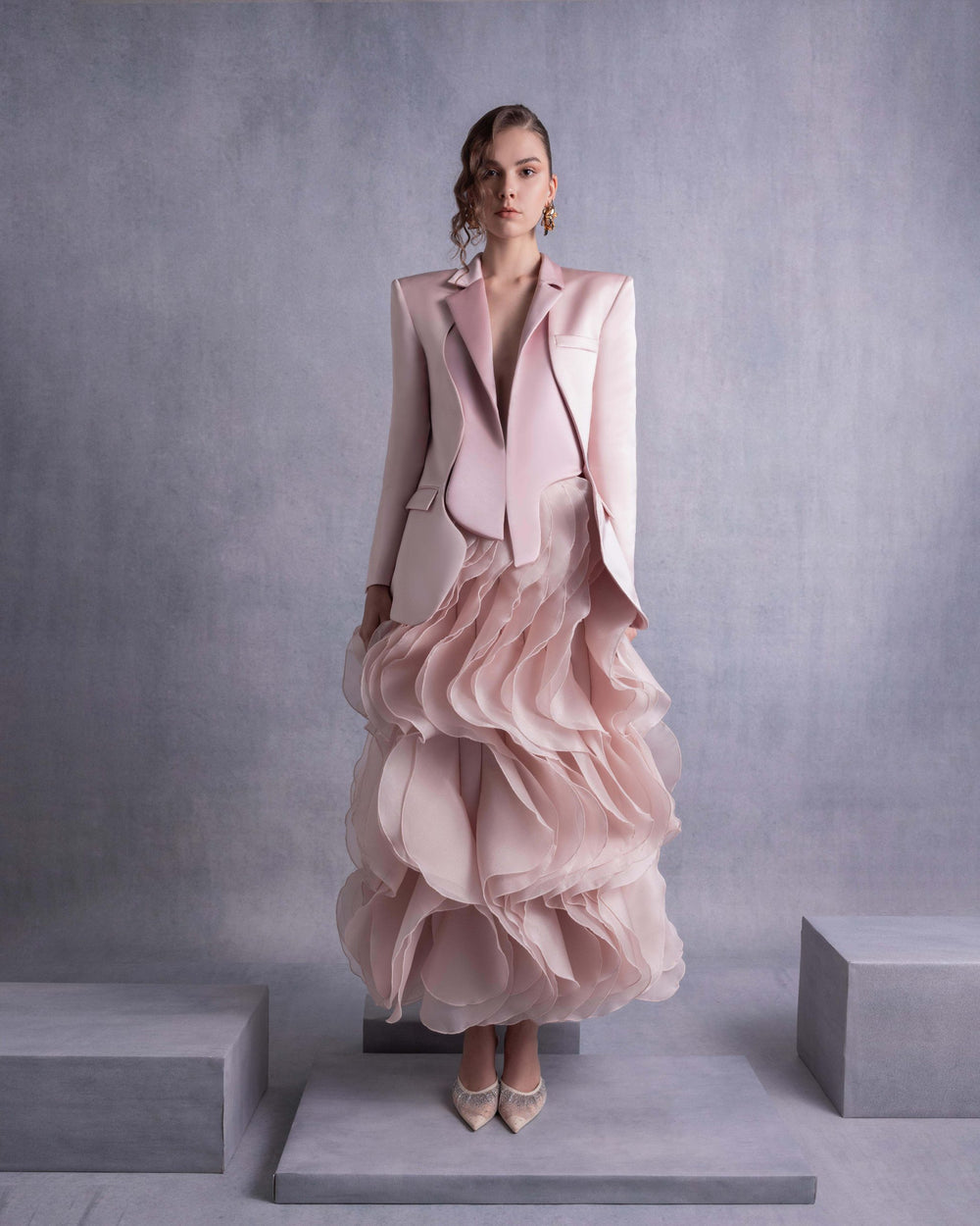 Discover elegance with a tailored pink razmir jacket featuring sharp lapels and sculptural wave-inspired back details for a modern, luxurious look.