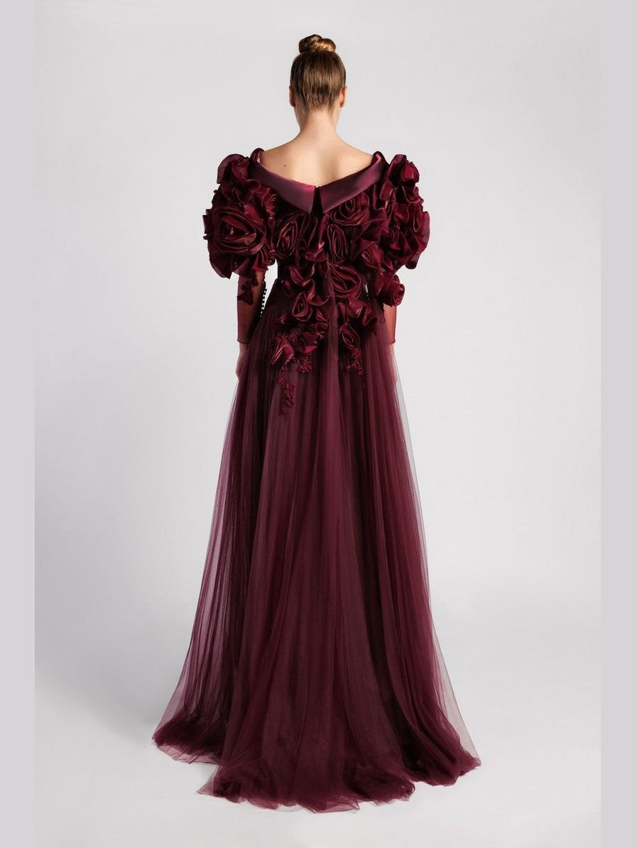 Burgundy long-sleeved tulle pleated A-line dress. Featuring a wide V neckline, a fitted bodice, and long sleeves adorned with organza flowers, giving it a puffy look. Complemented with a thin banded waist, a pleated A-line skirt, and organza flowers on the back of the dress.