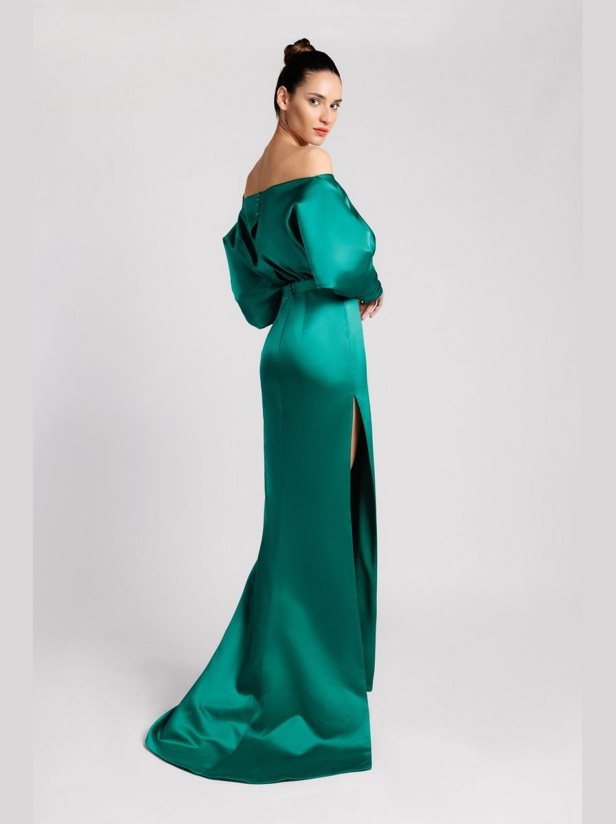Emerald green satin mermaid dress. Featuring an asymmetric neckline, with a draped bodice, one draped long sleeves, and another cold-shoulder sleeve with a sequin embroidered shoulder strap. Complemented with a thin banded waist, and a mermaid skirt with a side slit that flows into a sweep train