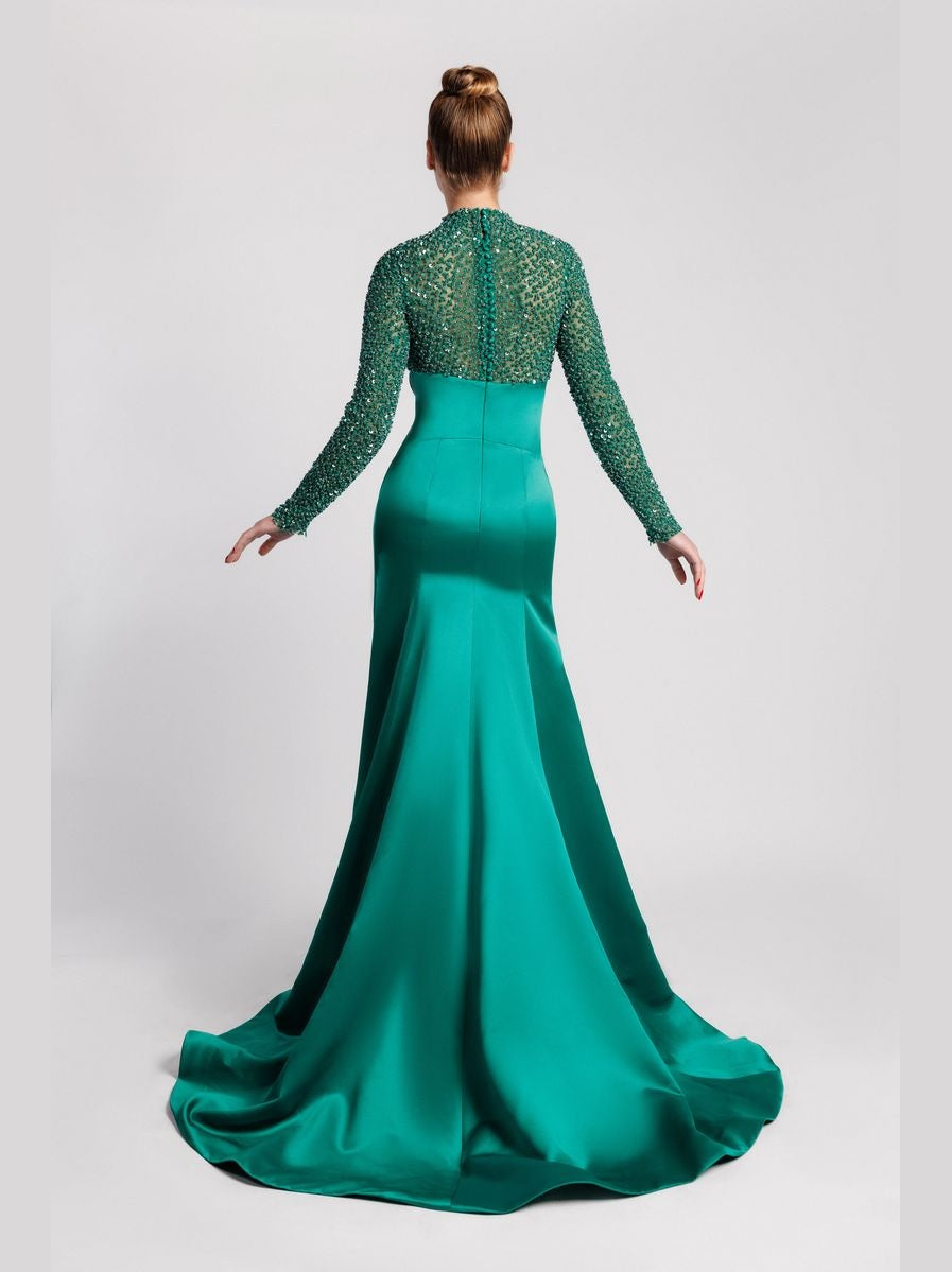 Emerald green long-sleeved mermaid dress. Featuring a jewel neckline, a fitted bodice with long sleeves fully embroidered with sequins. Complemented with a high- waist satin duchesse mermaid skirt, with folds detailing on the waist. Completed with a sweep train, and a flared hemline.