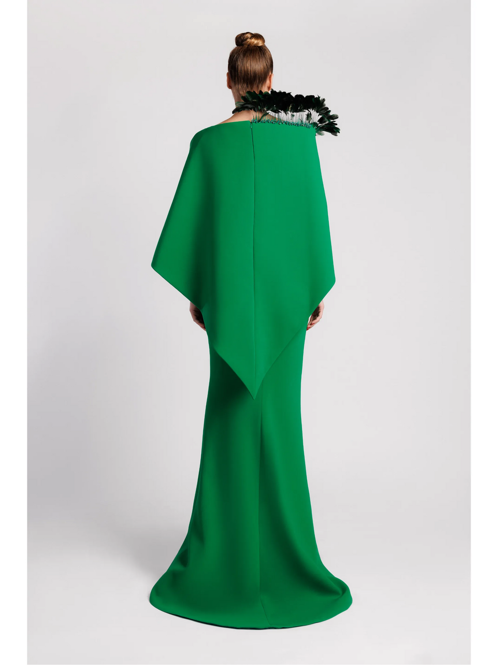 Green crepe sleeveless mermaid dress with a square neckline and fitted bodice, featuring a thin waist band. It has an off-the-shoulder cape with feathers on one side, which wraps around to form a sleeve. The fitted skirt flows into a sweep train