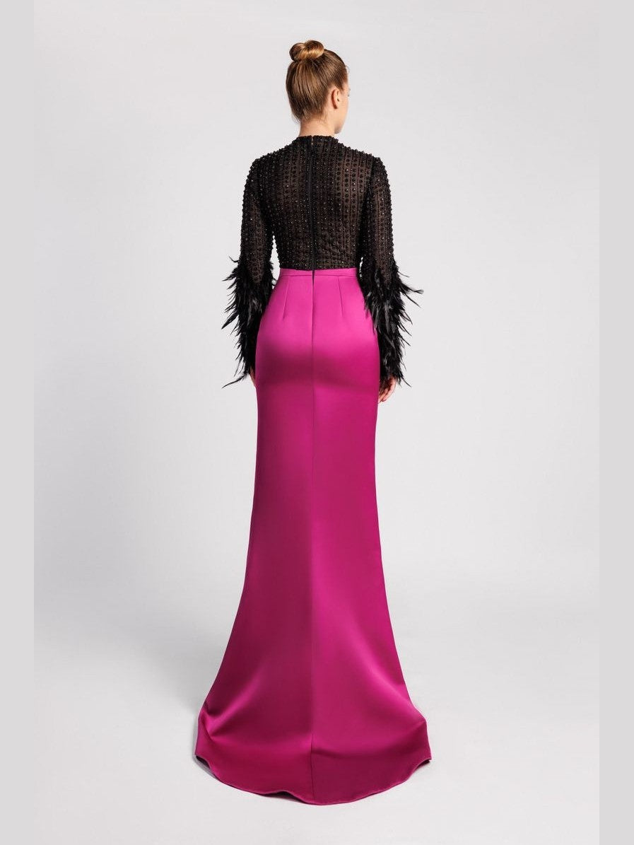 Black and fuchsia long-sleeved mermaid dress. Featuring a jewel neckline, a fitted bodice with black crystals, pearls, and Silenus embroidery, and long sleeves with the same embroidery as the bodice on the upper arm, and black feathers on the lower arm. Complemented with a fuchsia satin duchesse mermaid skirt.