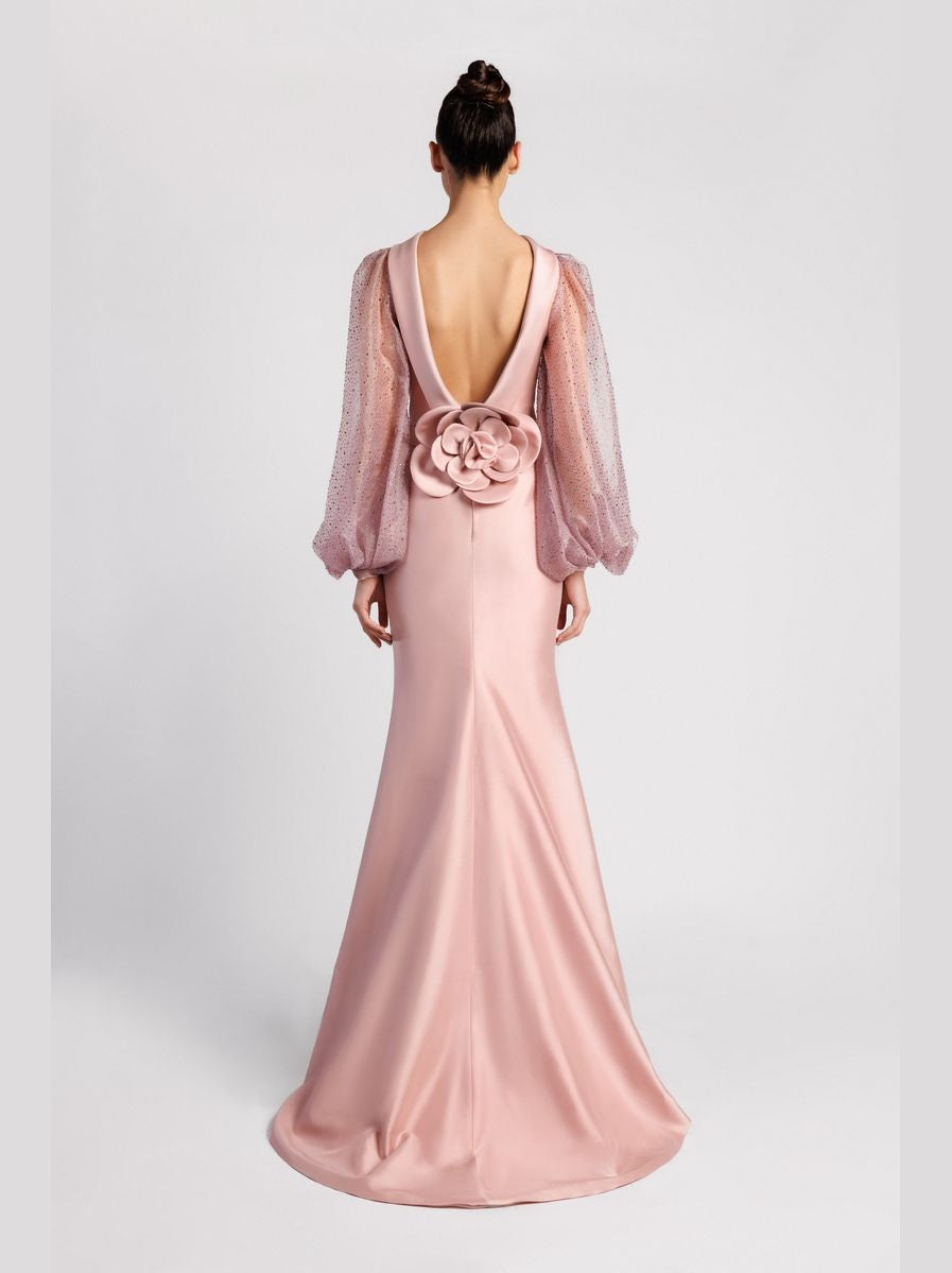 Pink long-sleeved cadi mermaid dress. Featuring slightly puffed organza bishop sleeves with crystal embroidery, and a cadi fitted bodice, with a closed neckline that connects at the shoulder lines from the back and reveals an V-shaped open back. Complemented with a mermaid skirt, and a cadi flower at the back.