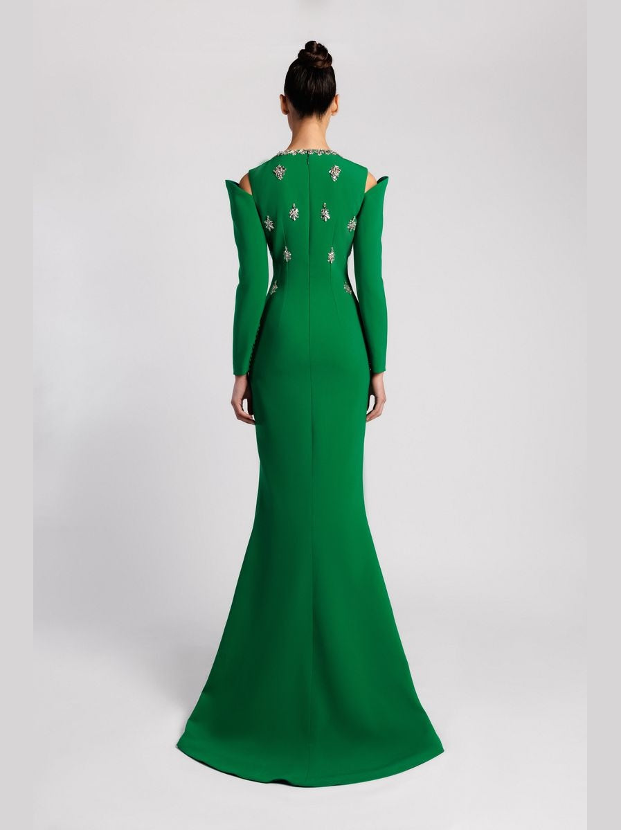 Green crepe long-sleeved mermaid dress. Featuring a jewel neckline adorned with crystal embroidery in the shape of a necklace. Complemented with long sleeves and slit on the head of the shoulders. The bodice has a slit down the chest, fitted, and embellished with big drops of crystal embroidery. Completed with a mermaid skirt, and a front slit.