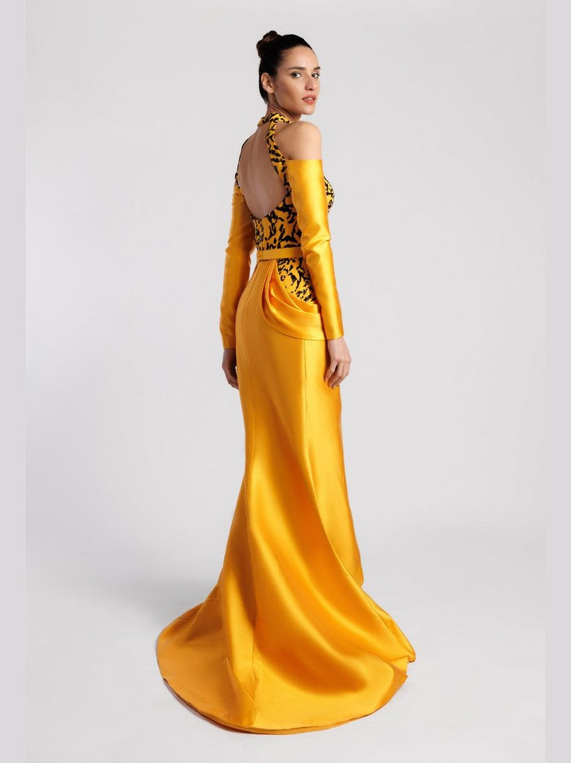 Yellow cadi mermaid dress. Featuring a high neckline, and cold-shoulders revealing yellow off-the-shoulder long sleeves. Complemented with a fitted bodice embroi- dered with black beads. Completed with a yellow mermaid skirt, a front side slit, and a waist belt, with one side of the hip draped, revealing the fabric as same as the bodice.