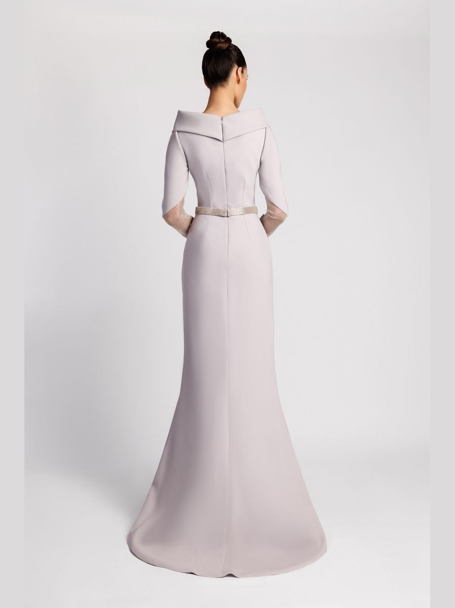 Gray crepe long-sleeved mermaid dress. Featuring a turned-down bateau neckline, long fitted sleeves, with the lower part crafted from embroidered tulle. Comple- mented with a silver waist belt, and a mermaid skirt with an asymmetric front slit.