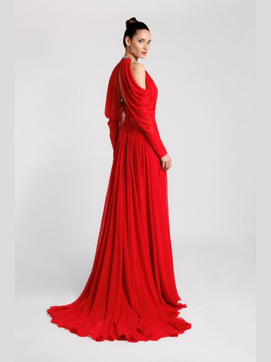 Red crepe georgette pleated A-line dress. Featuring three neckline designs, a jewel neckline adorned with crystal embroidery, cold-shoulders with draped long sleeves, and a keyhole neckline covered in sheer tulle. Complemented with a thin banded waist, a pleated fitted bodice, and a pleated A-line flared skirt that flows into a sweep train.