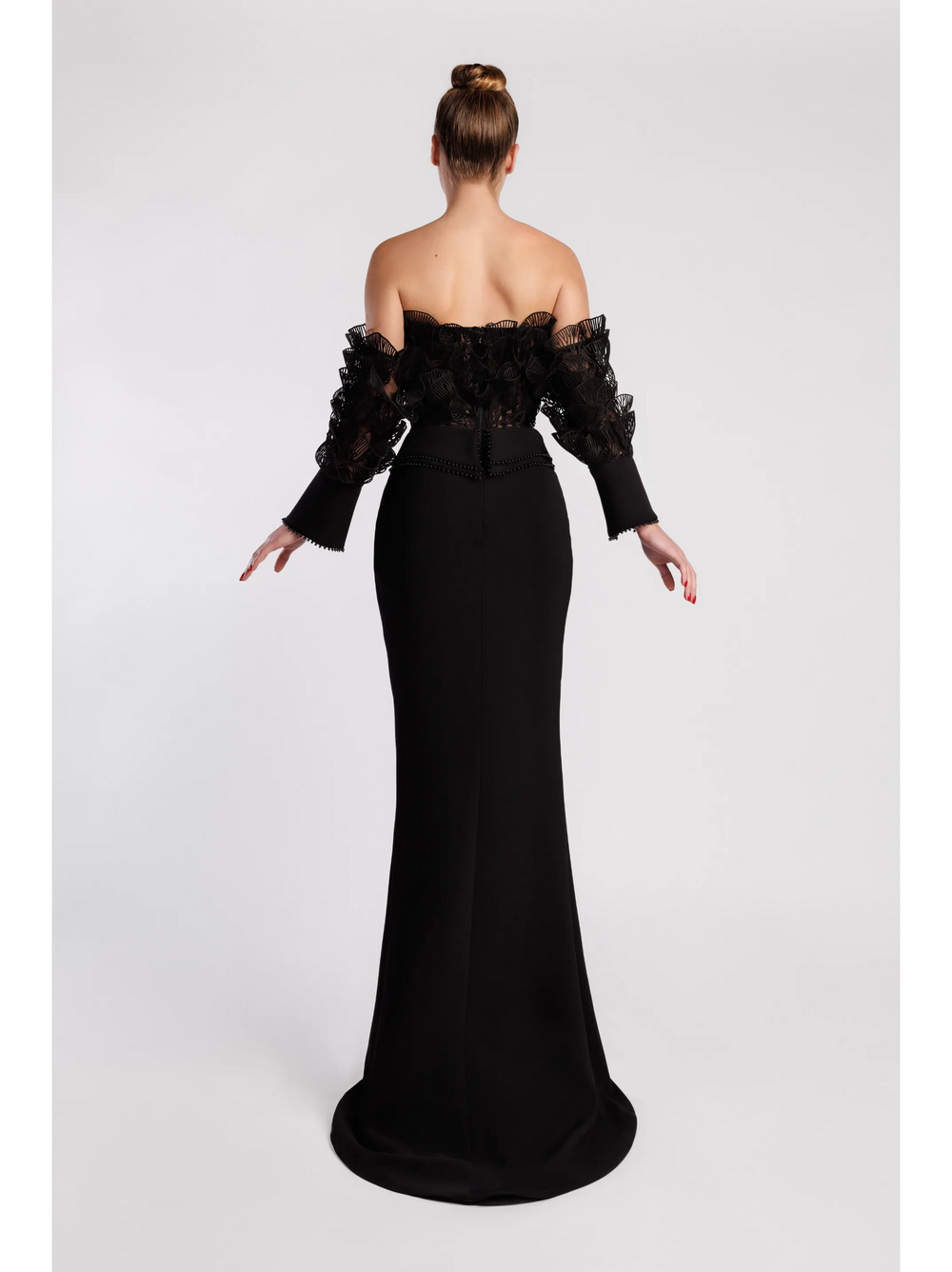 • Bodice and Sleeves Made from Laser-Cut Black Petals and Black Pearls