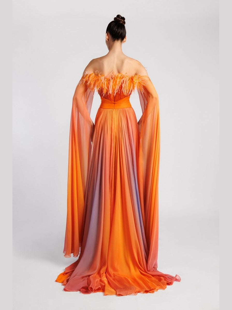 Orange chiffon pleated off-the-shoulder A-line dress. Featuring a pleated fitted bodice with orange feathers protruding from the neckline. Complemented with long cape sleeves, a thick orange waist belt, and a flared A-line skirt. The dress has subtle hints of purple.