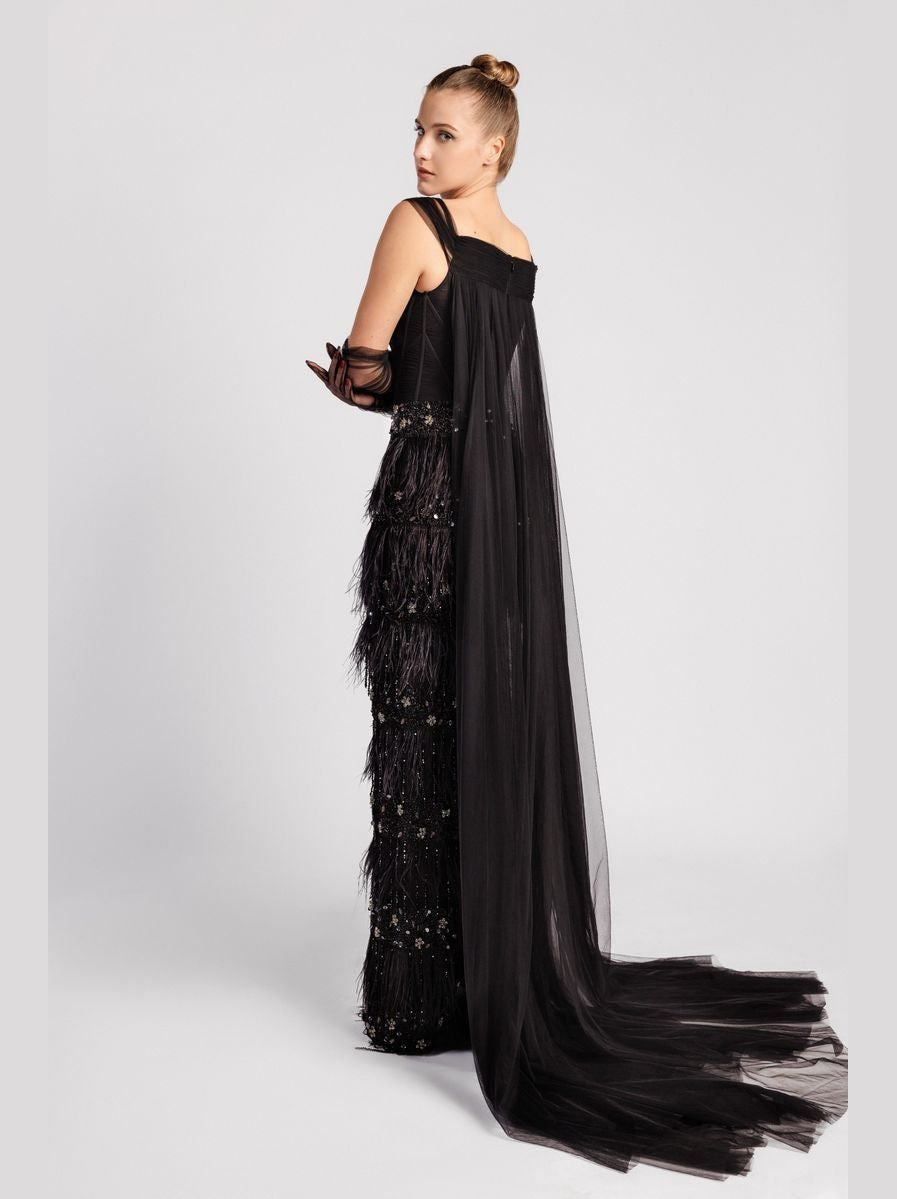 Black sleeveless tulle and embroidered straight-cut dress. Featuring a square neckline, a corset bodice crafted from draped tulle, and black sheer tulle gloves. Comple- mented with an embroidered straight-cut skirt with layers of fringed feathers. Completed with a tulle Watteau train.