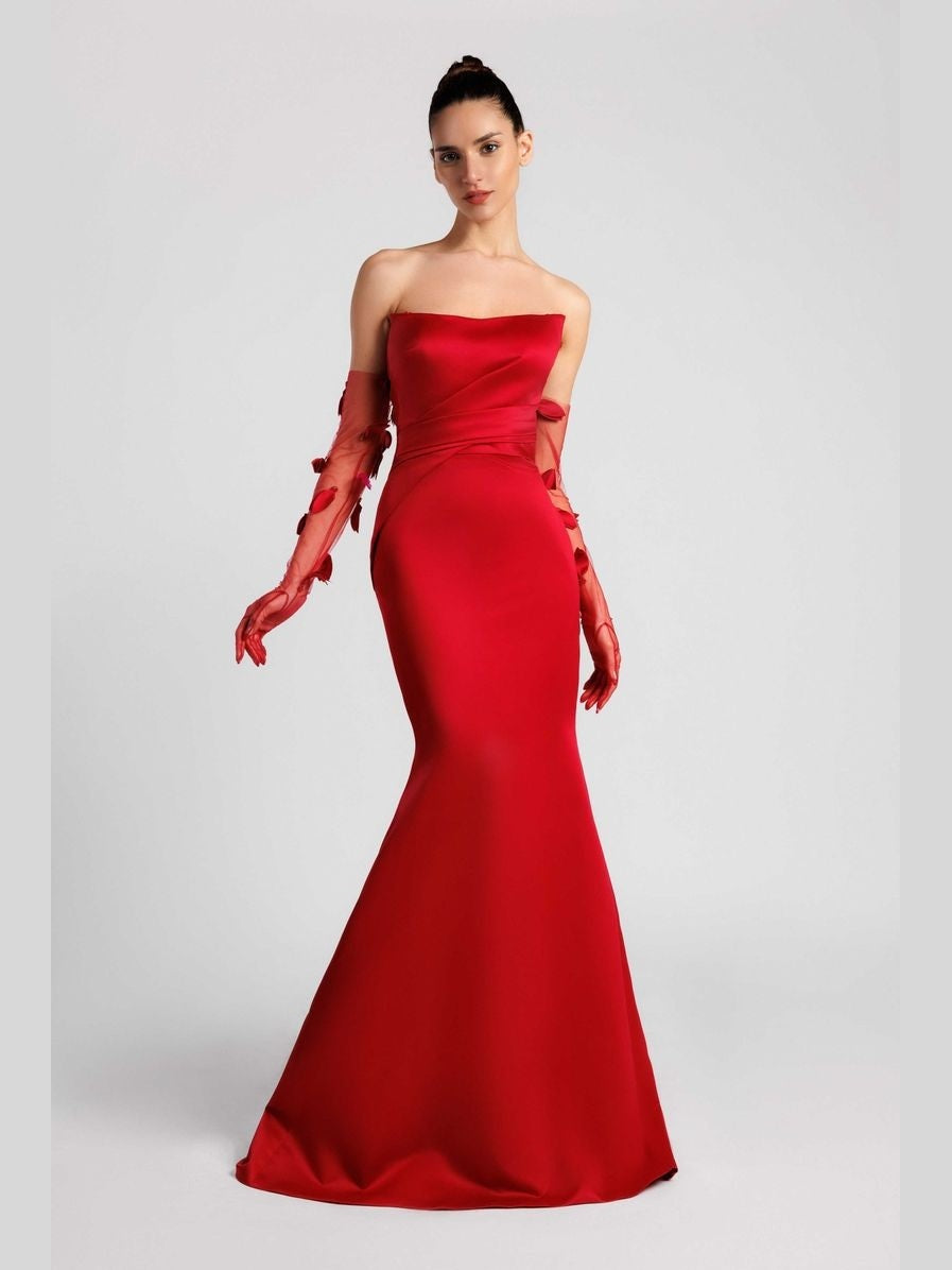 Red satin duchesse strapless fitted mermaid dress. Featuring a straight neckline, and a fitted bodice with folds detailing around the waist. Complemented with a sleeveless kaftan crafted from laser-cut satin flower petals and feathers all over, held at the neck. Completed with a side bow design on one side of the shoulder, and tulle gloves.