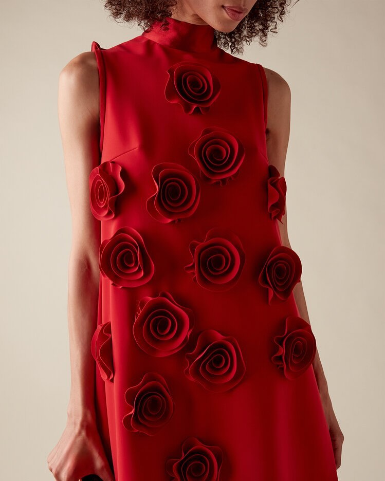 The Quince Rose Dress by Greta Constantine is a chic trapeze silhouette adorned with striking rosette appliqués. Featuring an elegant tie detail at the neckline, this versatile dress combines modern artistry with effortless sophistication, making it perfect for standout occasions.