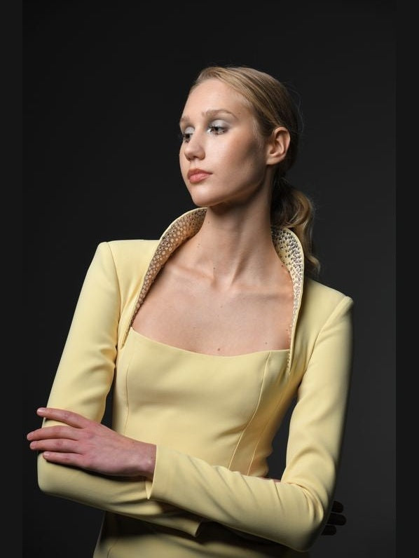 Yellow crêpe dress with embroidered collar.