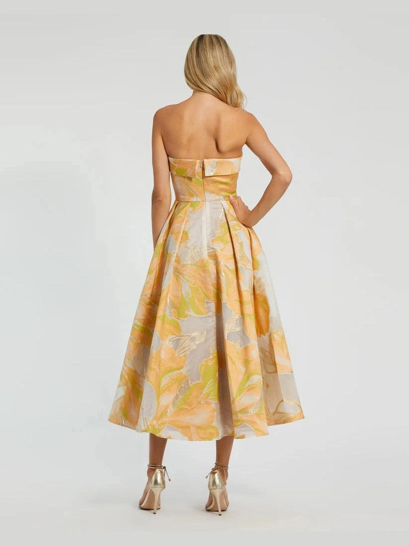 Beige and Orange Strapless Brocade Midi Dress with Pockets