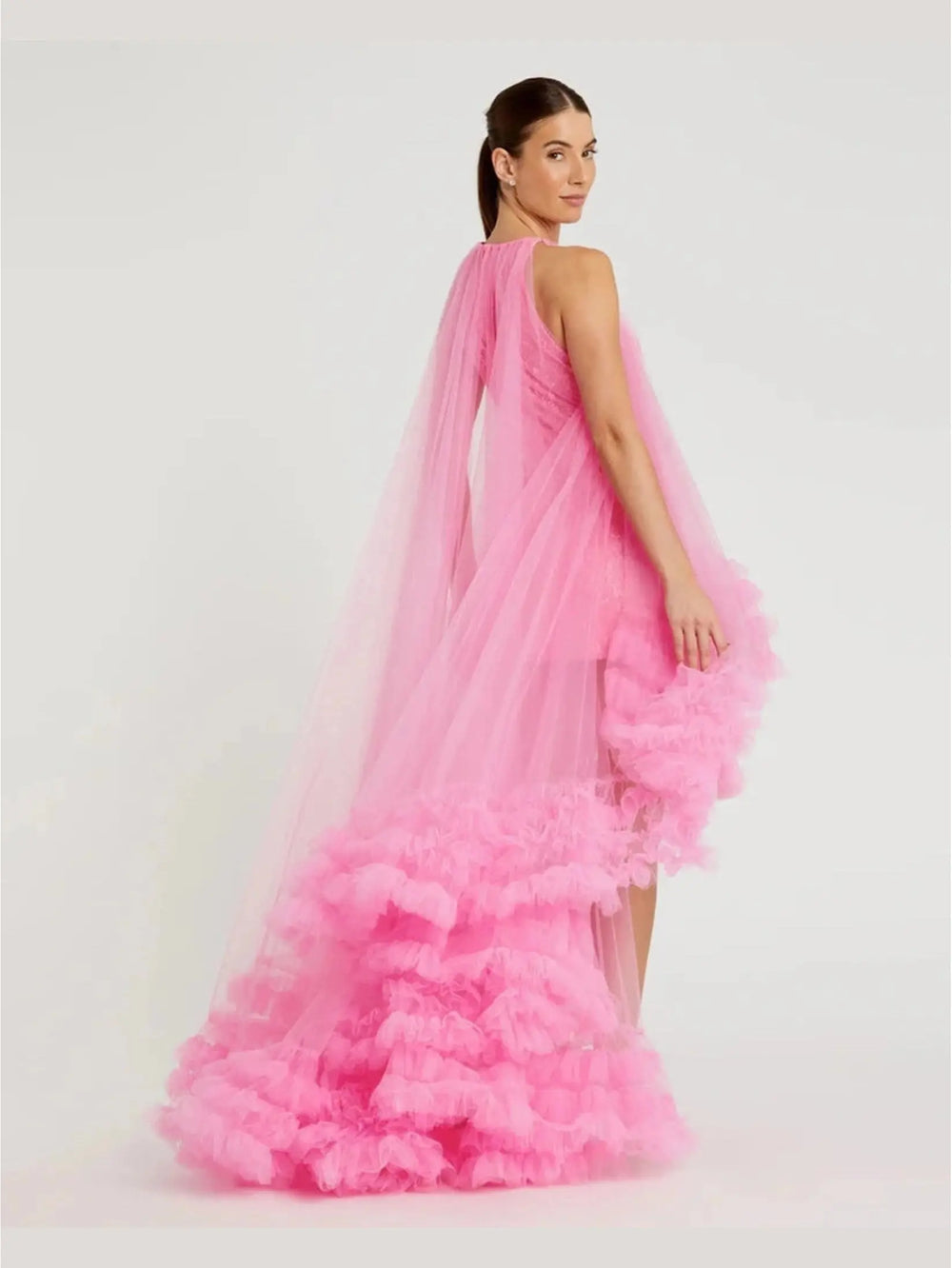 Pink Tulle High Neck Sleeveless Ruffled Hem Hi-Low Gown