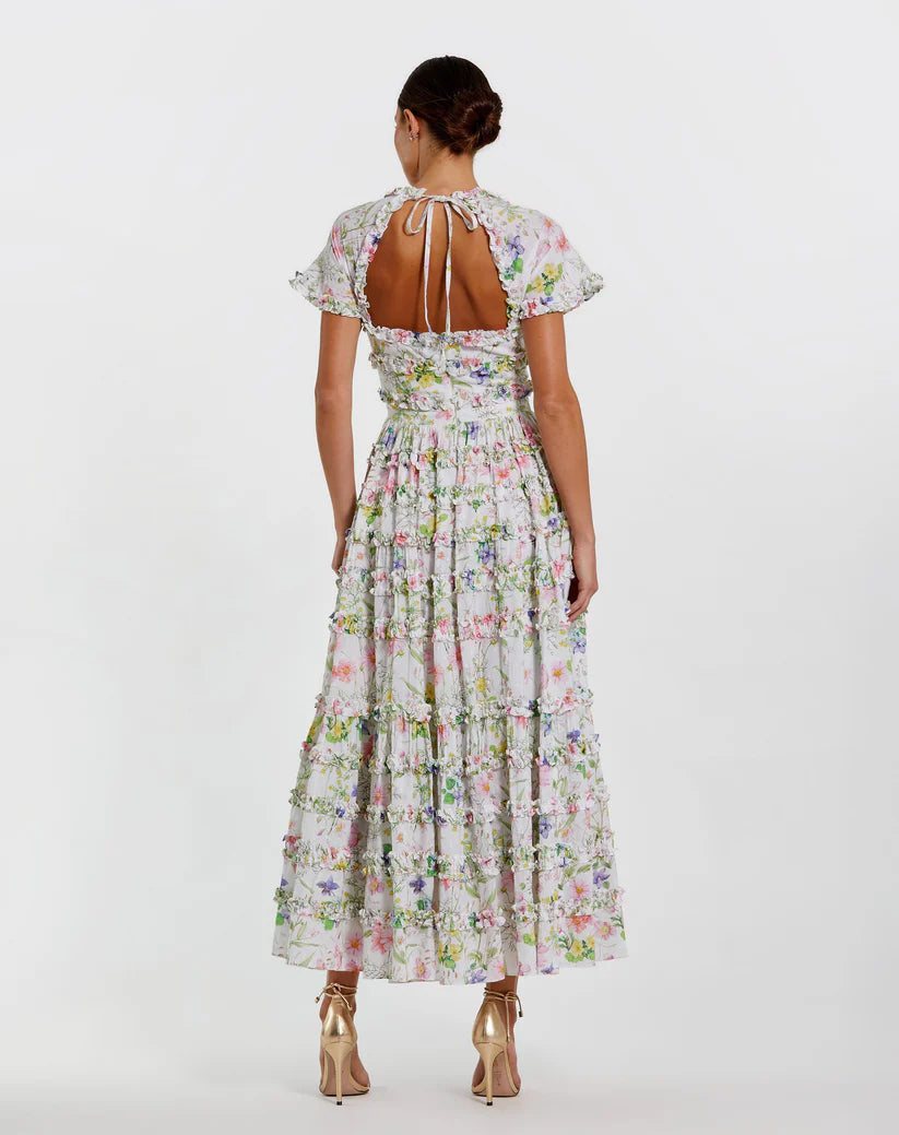 This floral-printed cotton midi dress features a delicate V-neck, cap sleeves, ruffled frill details, and a flattering A-line silhouette. The open back with a tie neck adds a playful, chic touch, making it perfect for daytime occasions.
