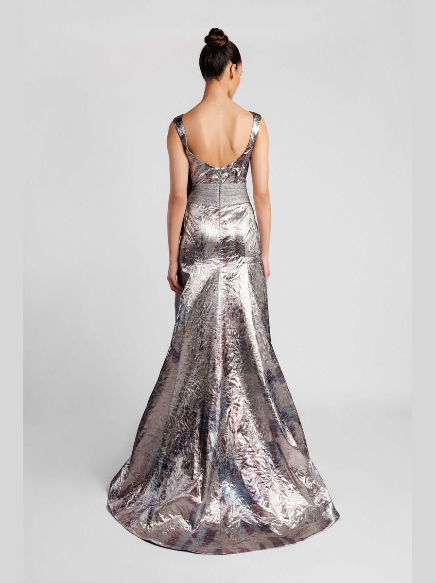 Silver sleeveless taffeta Lurex A-line dress. Featuring a square neckline, a fitted bodice, and a wide V-shaped open back. Complemented with a gray embroidered band- ed waist that ties in a big bow at the side. Completed with an A-line dress, and light purple subtle vertical stripes along the dress.