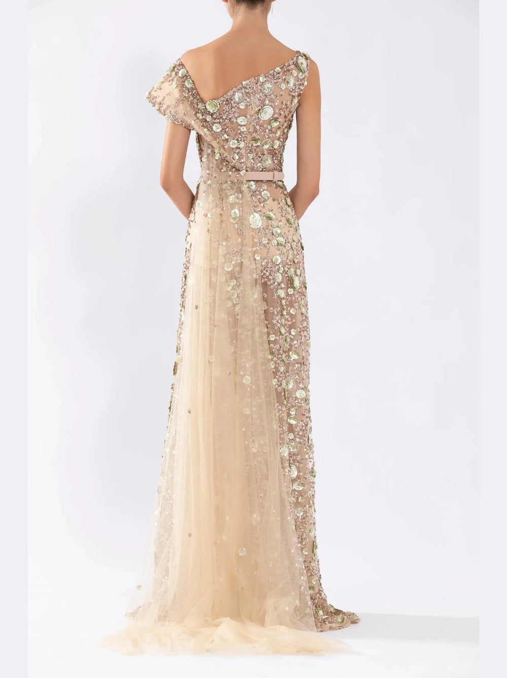 SKIN TULLE BEADED OFF SHOULDER DRESS