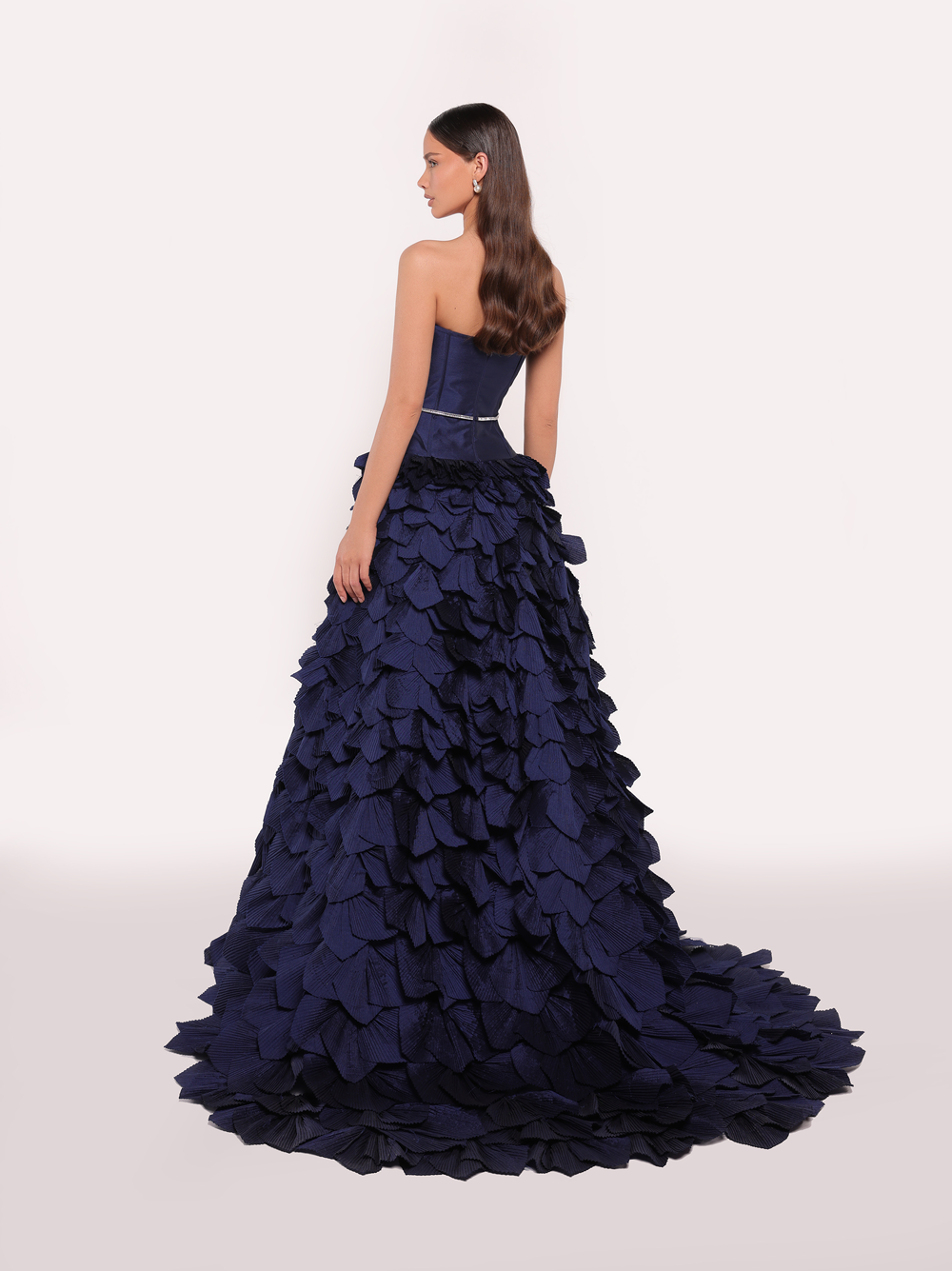 This strapless gown radiates bold elegance with its structured bodice and voluminous skirt adorned with layered petal-like details, creating a captivating 3D effect. Perfect for making a grand statement, this dress embodies sophistication and drama.