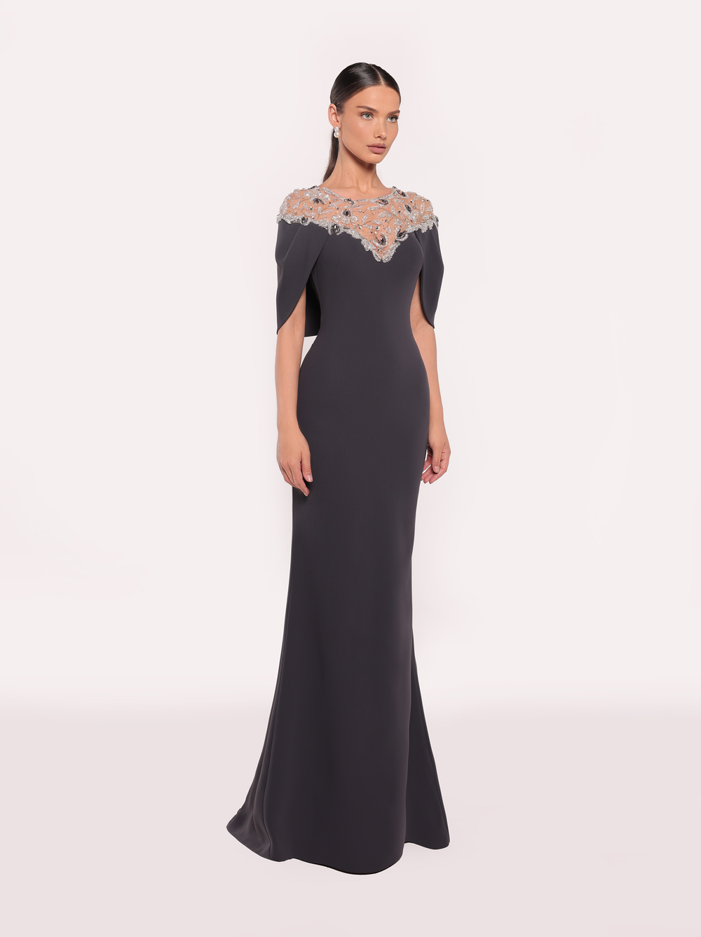 This stunning gown combines elegance and sophistication with its form-fitting silhouette and dramatic cape sleeves. The embellished illusion neckline adds a touch of intricate glamour, making it an exquisite choice for formal evenings.