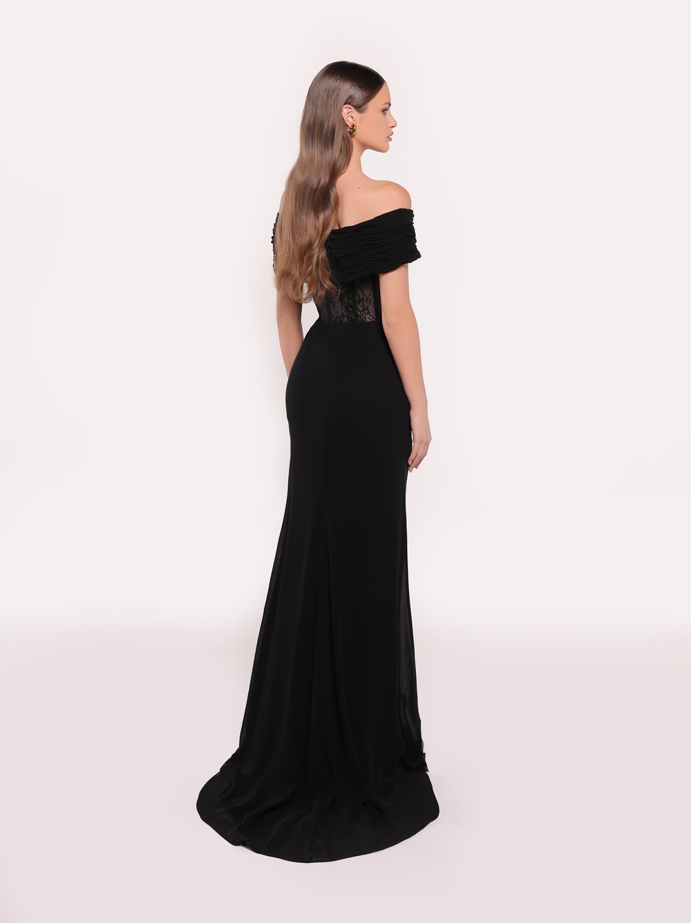 An alluring off-the-shoulder gown featuring a lace bodice that adds a touch of sensuality. The dress is adorned with oversized floral appliques at the waist, cascading into a figure-hugging draped skirt with a side slit for an elegant reveal.