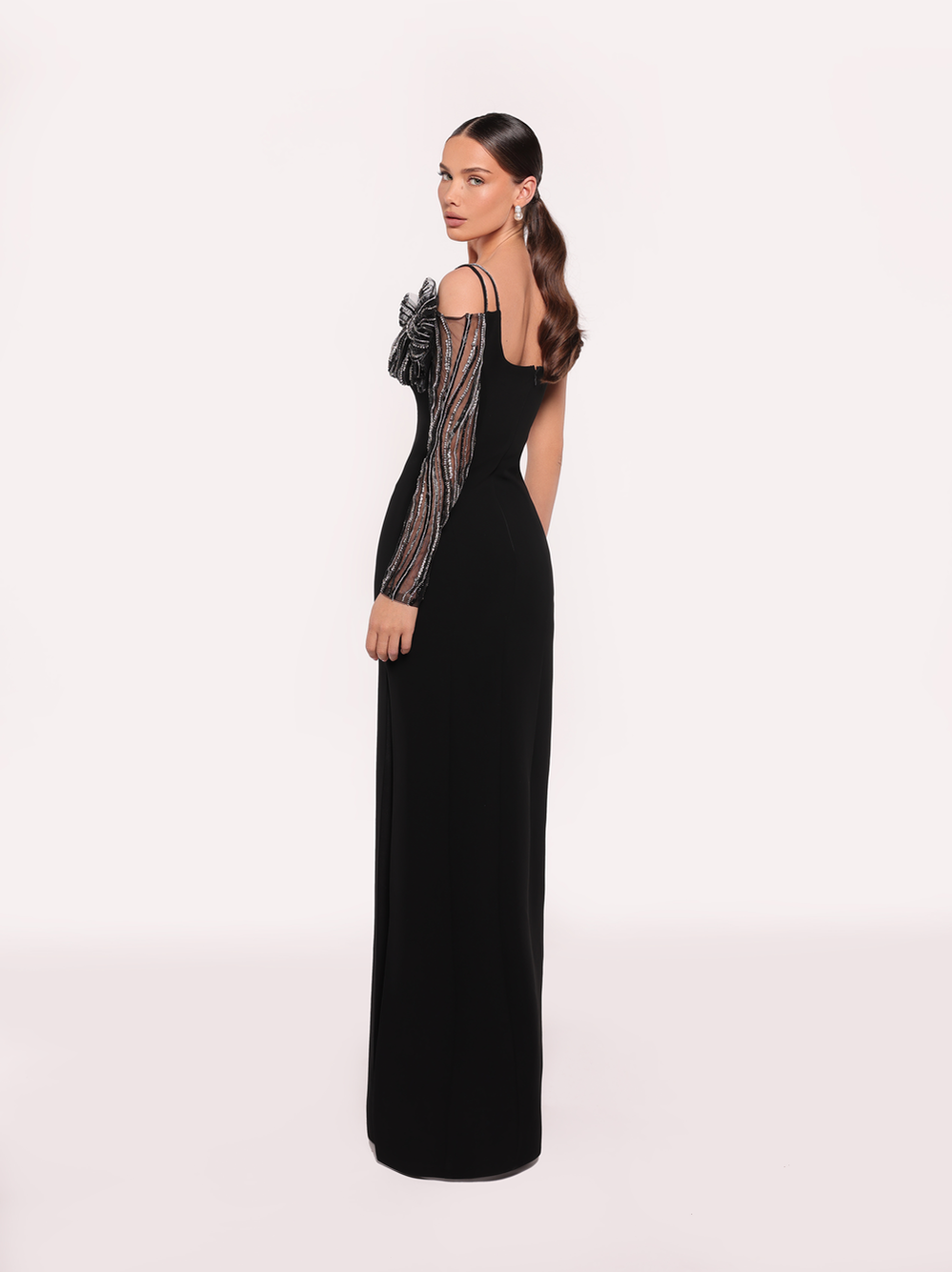 This sophisticated gown stands out with its asymmetrical design, featuring a single embellished sleeve adorned with intricate beadwork and a bold bow detail on the shoulder. The fitted silhouette complements the modern aesthetic, making it a striking choice for any formal occasion.