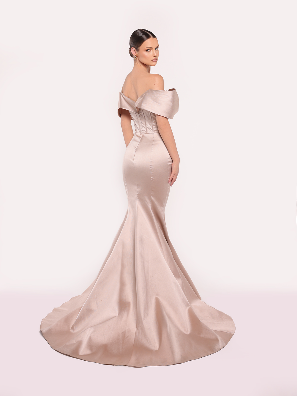 This stunning gown features a dramatic off-shoulder neckline adorned with an oversized bow detail, exuding elegance and sophistication. The corset-style bodice highlights the waist, leading into a figure-flattering mermaid silhouette that gracefully flows to the floor. Perfect for those seeking a luxurious and timeless look.