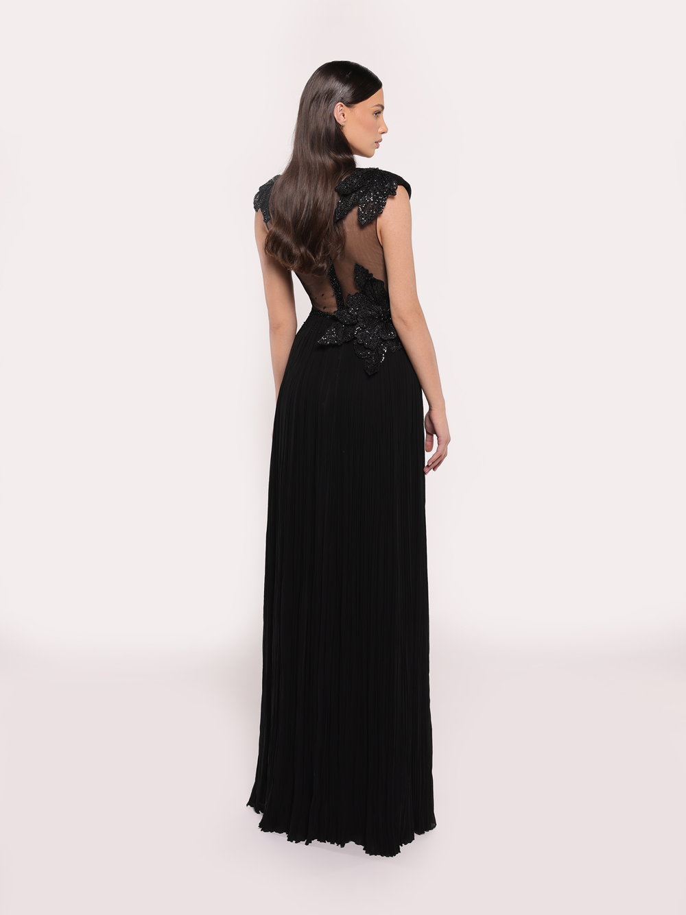 This elegant gown showcases a deep V-neckline with delicate pleating that cascades down, creating a statuesque silhouette. Intricate detailing at the waist adds a touch of refinement, perfect for an effortlessly sophisticated look.