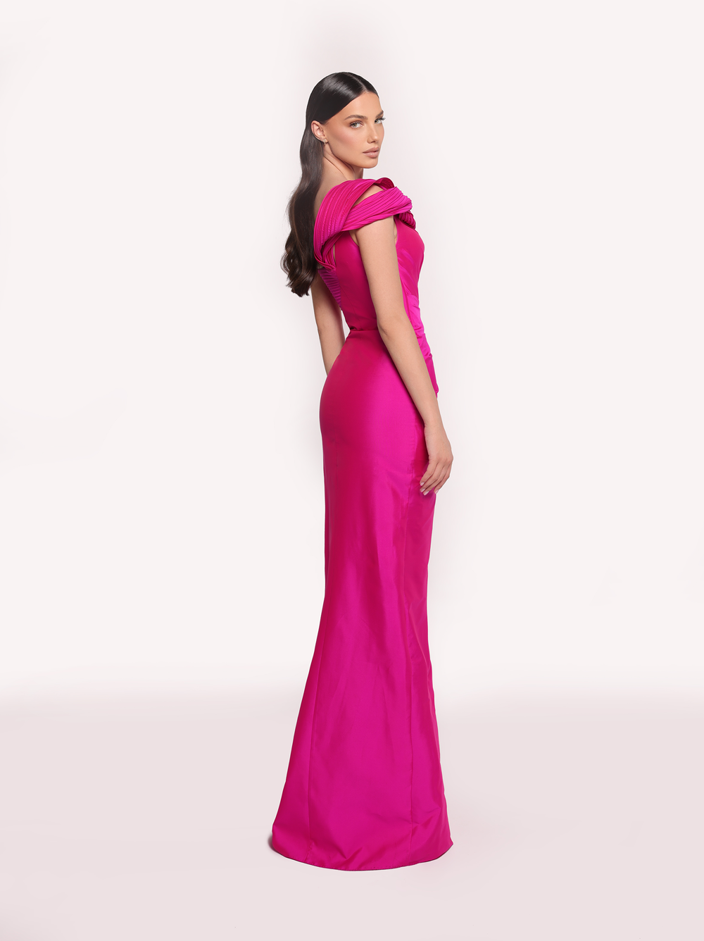 This striking one-shoulder gown captivates with its structured pleats that gracefully wrap around the bodice, creating a sculptural effect. The asymmetrical design is enhanced by a voluminous shoulder detail, adding bold elegance to the look. Ideal for those seeking a refined yet dramatic entrance.
