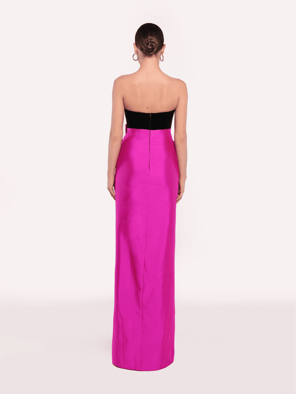 This chic strapless dress features a sleek black velvet bodice that elegantly contrasts with the vibrant skirt. The high-waisted bow detail enhances the waist, adding a playful touch to this sophisticated ensemble. Ideal for cocktail events and semi-formal gatherings.