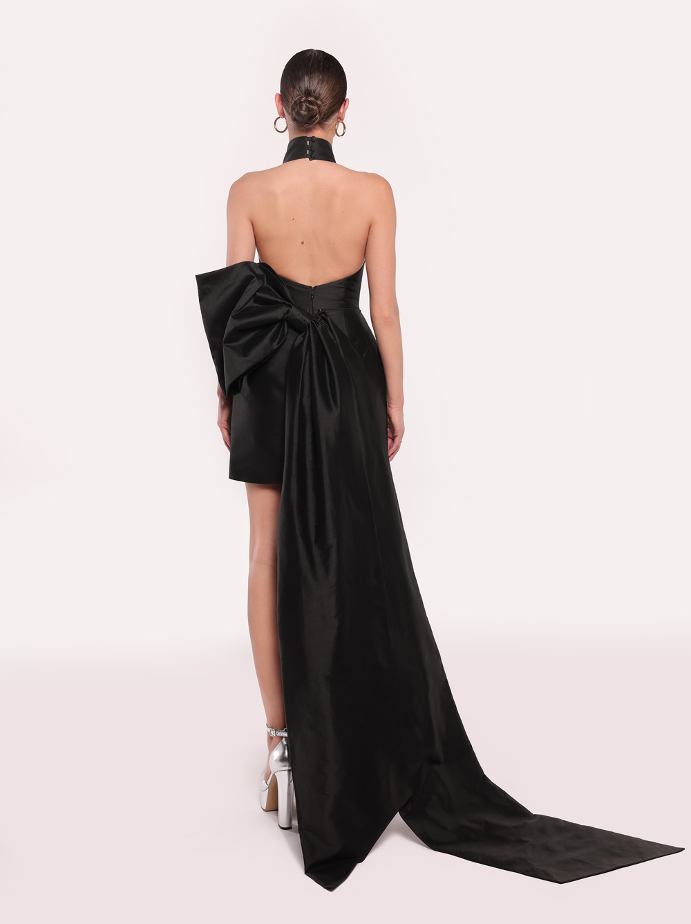 A sophisticated mini dress with a high neckline and an unexpected dramatic train, adding elegance to its modern silhouette. Delicate floral embellishments on the side complete this statement piece, ideal for a bold yet refined look.