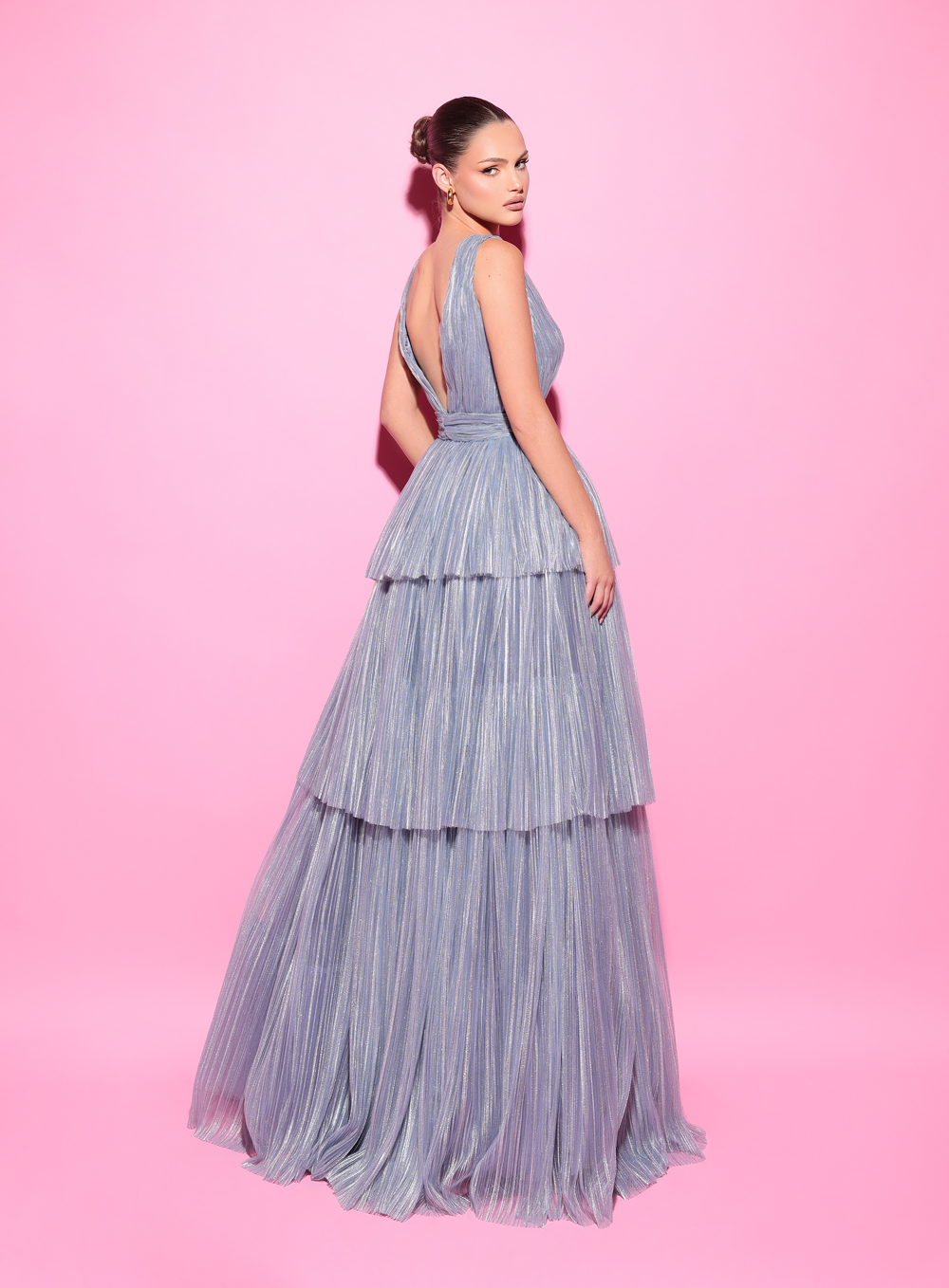 A captivating tiered gown with a deep V-neckline and a belted waist, showcasing layers of delicate pleats that add volume and movement. This design exudes timeless elegance and sophistication.