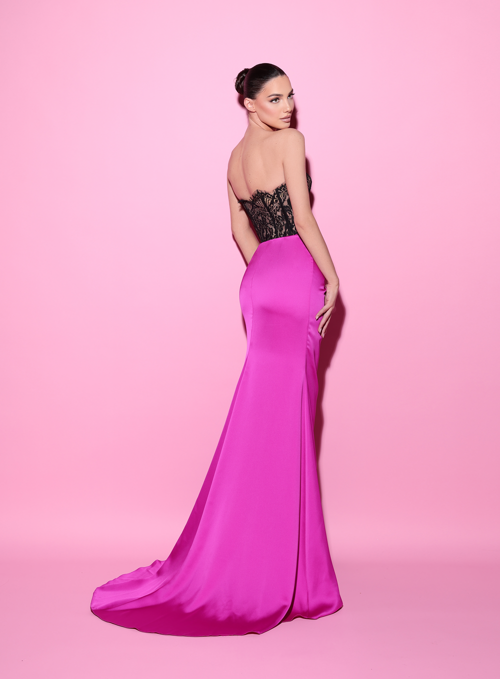 This dress combines elegance with allure, featuring a strapless, lace-embroidered bodice and a satin skirt with a high slit. The intricate lace detail around the waist accentuates the silhouette, adding a touch of sophistication to the bold design.