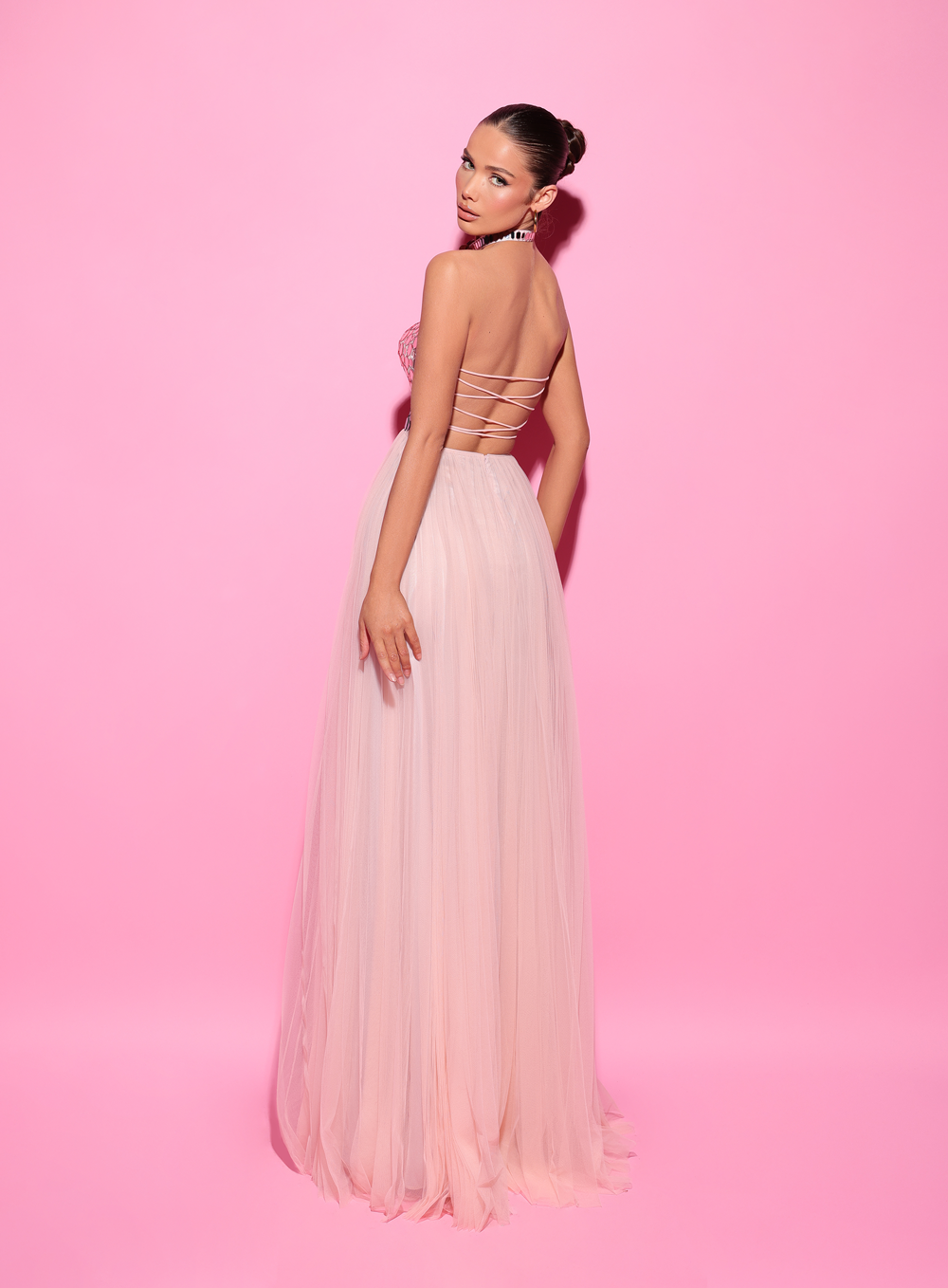 A striking blend of modern edge and feminine grace, this gown features a structured bodice adorned with reflective elements, creating a bold contrast against the soft, flowing tulle skirt. The high neckline and decorative bow add an unexpected touch, elevating the look for a truly memorable evening.