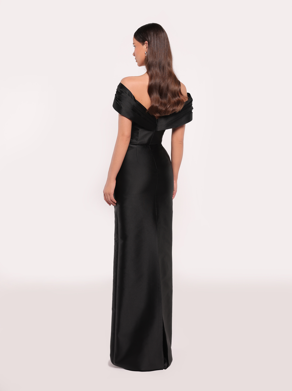 An off-the-shoulder gown with a classic, form-fitting silhouette. This dress features a structured bodice with subtle pleating and a delicate feather detail that adds a hint of drama, perfect for an elegant evening.