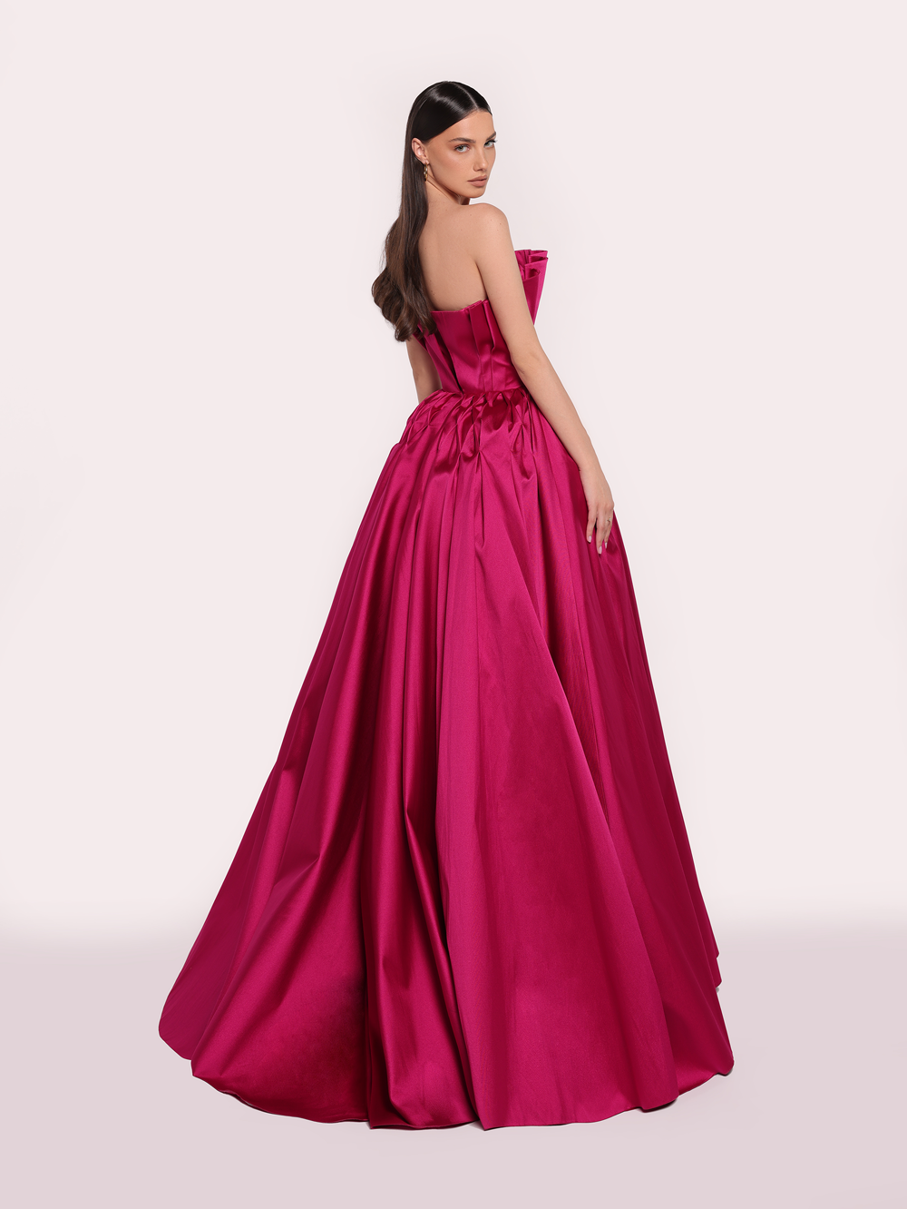 This strapless gown radiates an enchanting elegance with its structured bodice and voluminous skirt. The pleated details around the neckline add a hint of architectural sophistication, while the luxurious fabric and full silhouette create a dramatic presence. This dress is perfect for those looking to make a lasting impression at any grand event.