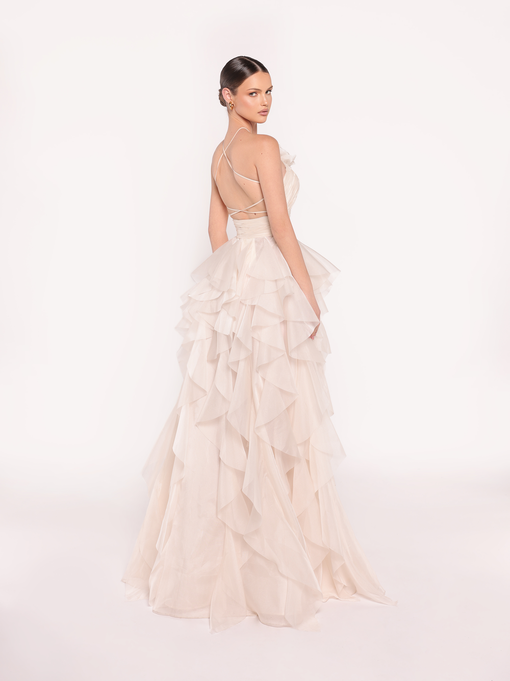 This gown exudes timeless romance with its halter neckline adorned with a delicate floral embellishment and a layered, flowing skirt. The soft ruffles cascade gracefully, adding volume and elegance for a dreamy, ethereal presence.